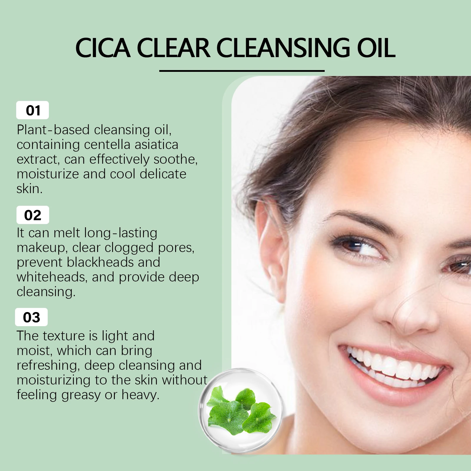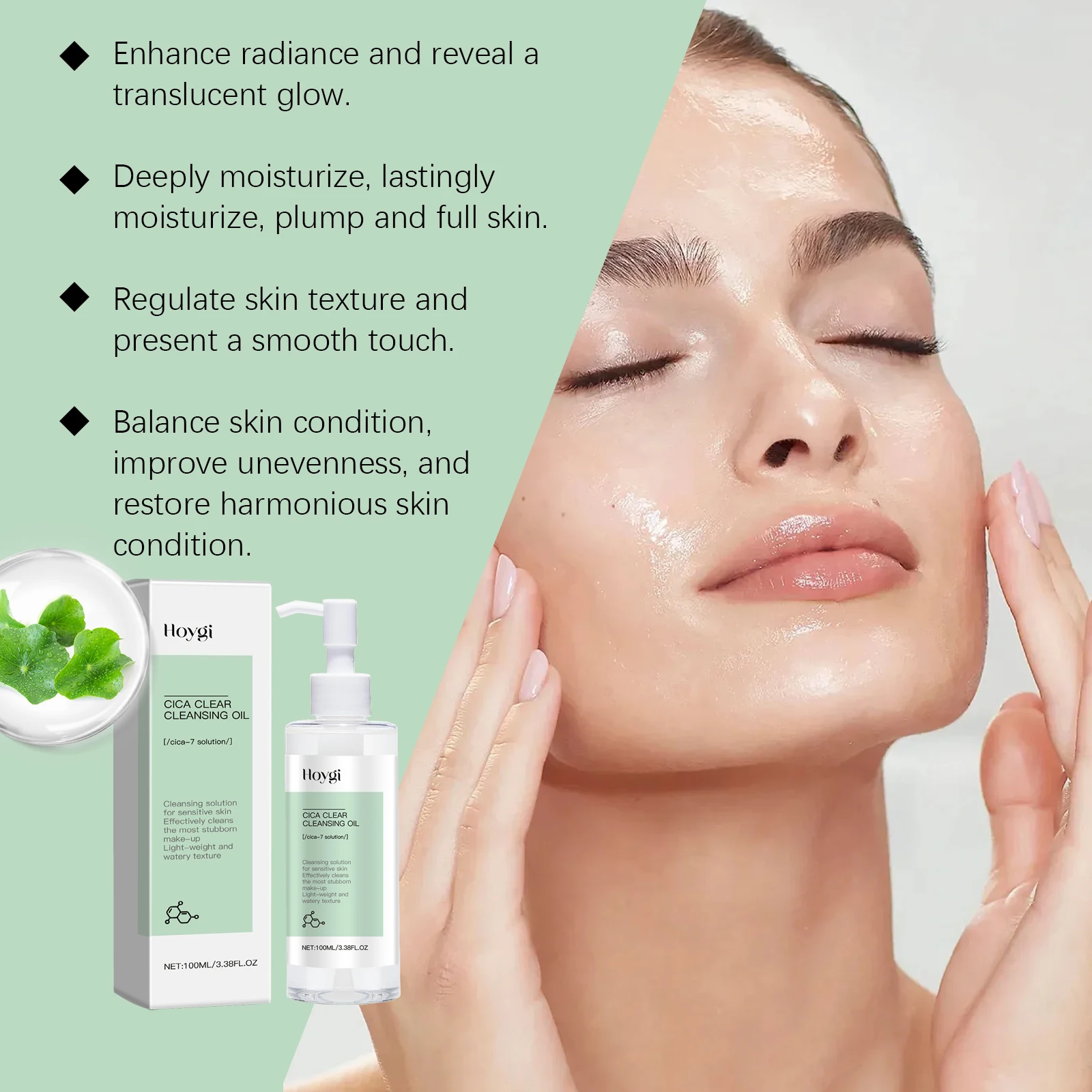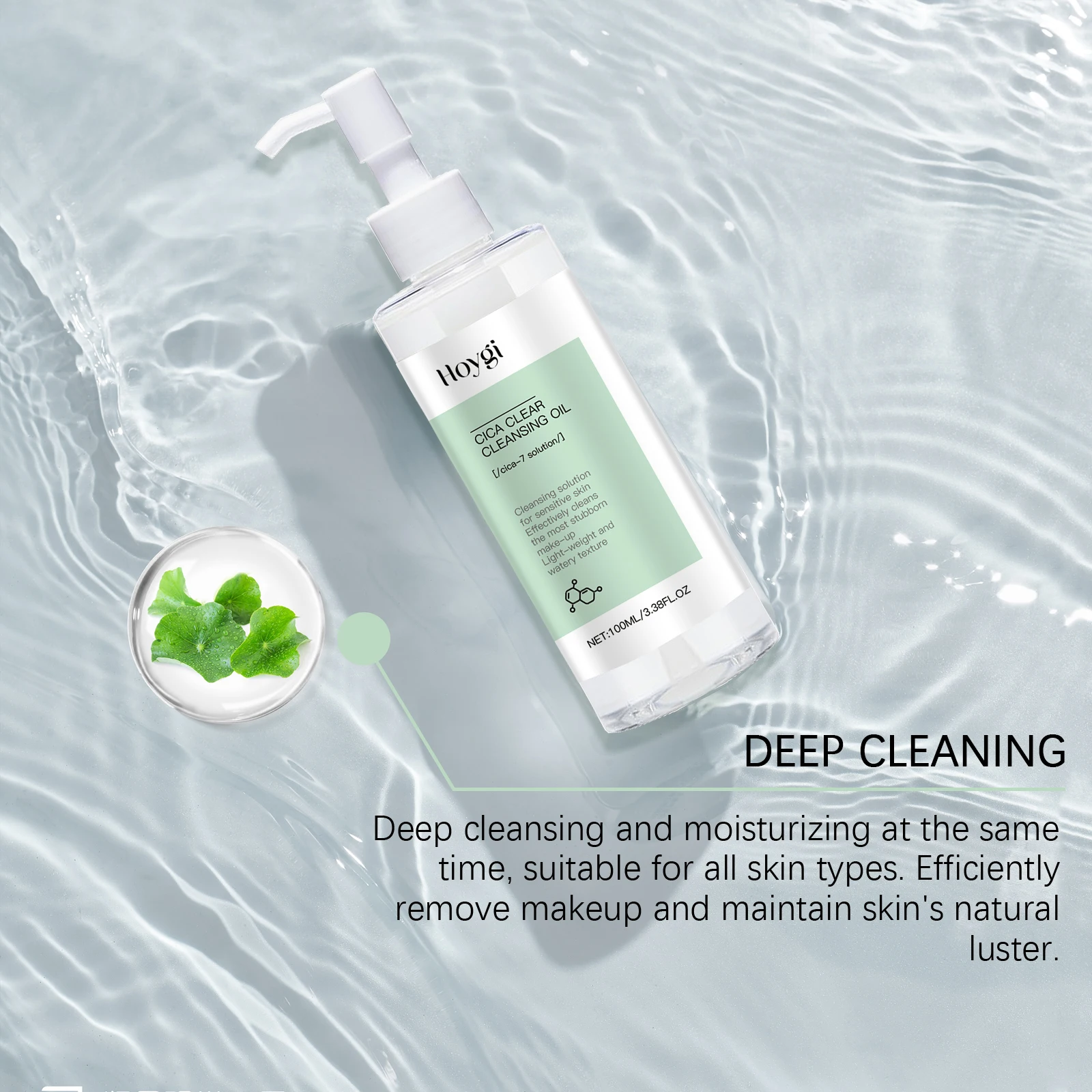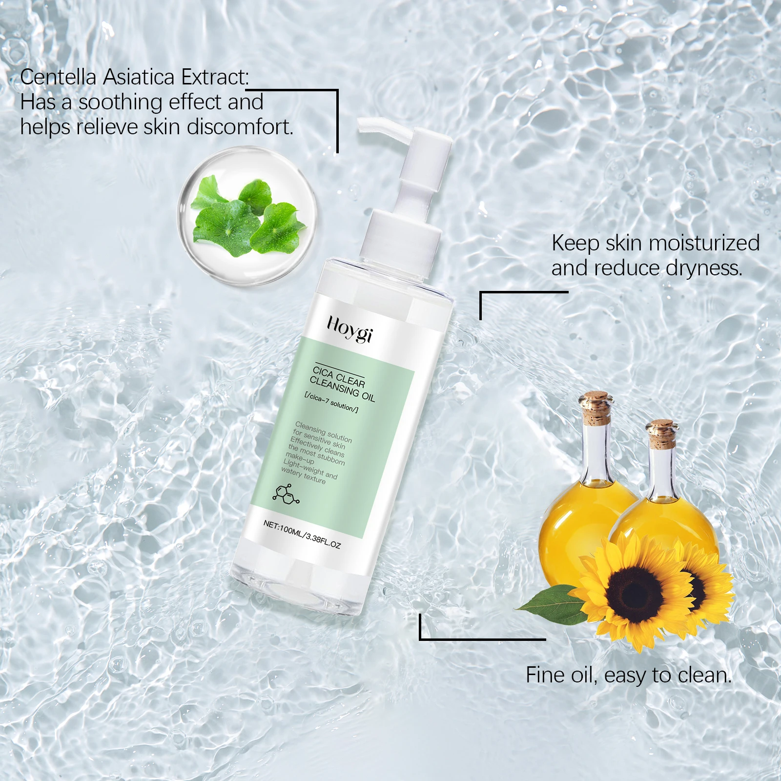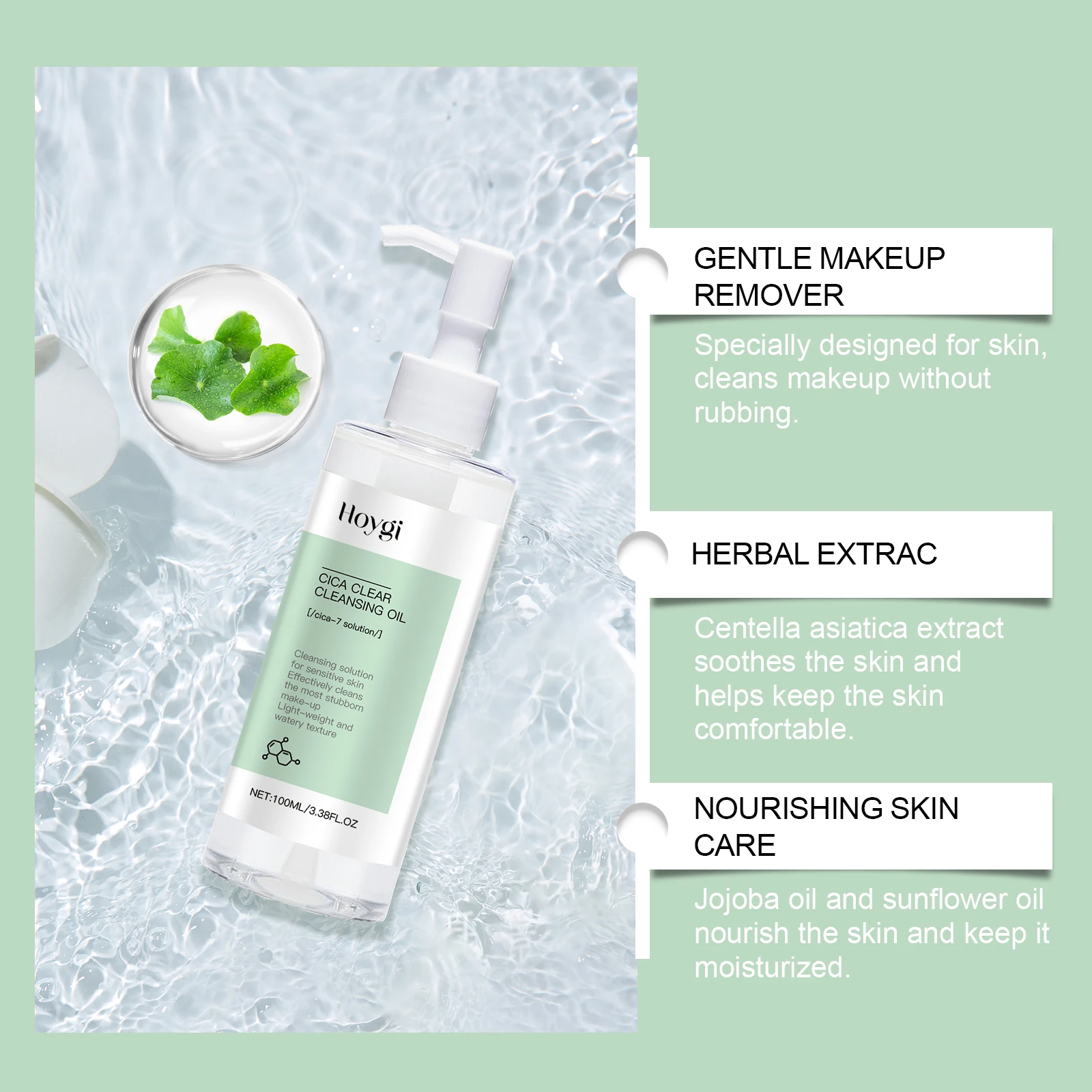1. Plant-based cleansing oil, containing centella asiatica extract, can effectively soothe, moisturize and cool delicate skin.